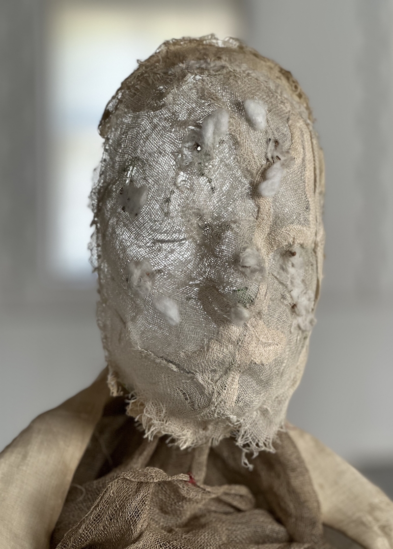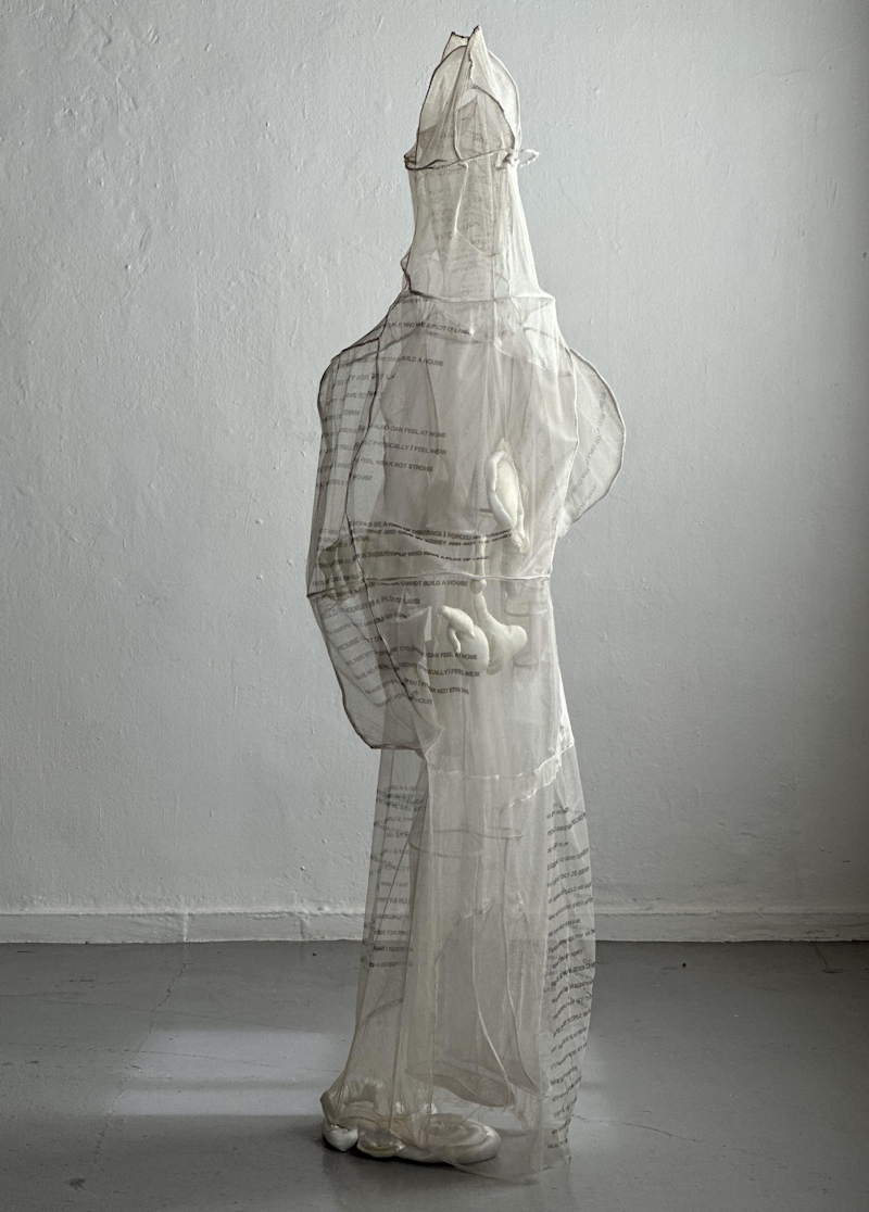 In de trein lees ik de krant. ‘Mijn geboortestad is de hel op aarde’, schrijft Journalist Enaam Alnour over Darfur waarde oorlog opnieuw is uitgebroken. Dan loop ik de expositie van Christiaan Bastiaans binnen in Club Solo in Breda. In de eerste zaal hangen sculpturen als kledingstukken vrij in de ruimte: de Hurt Models. Capsid Agent heeft een bovenlijf dat is bedrukt met krantenknipsels over de oorlog In Sierra Leone uit 1998. Een middeleeuwse figuur heeft een gezicht bedekt met kralen, als een huidziekte, en staart lam geslagen voor zich uit. Om zijn nek een gebreid boordje in de kleur van bloedkoraal. De Hurt Models zijn de mensen die een oorlog moeten doorstaan, gedwongen op de vlucht zijn, hun organen verkopen om te kunnen overleven, kindsoldaten. Ondertussen klinkt de gebroken stem van Jeannne Moreau door de ruimte, zij speelt in Club Mama Gemutlich de vrouw in een glanzend witte jurk die troost komt brengen in een hospitaal-achtige omgeving vol pijn en vervreemding.