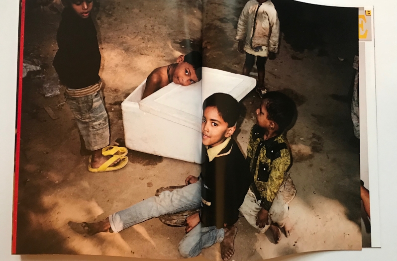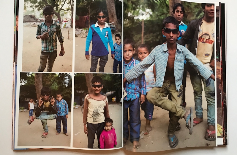 Het boek gooit je de straat op, midden in de drukte en het is alsof de fotograaf niet wist waar te beginnen, koortsachtig om zich heen kijkend meer indrukken opdoet dan het boek kan bevatten. Het opent met enkele spreads van lachende jongetjes wiens gezichten een beetje zijn vervormd door de lens. Een jongetje met zijn mond wijd,wijd open lijkt wel een kleine boeddha door de glanzende huid waar het licht op valt. Straatkinderen, bijna iedereen die India heeft bezocht komt thuis met vertederende foto’s van straatkinderen. Maar deze foto’s zijn absurdistisch en vol plezier.