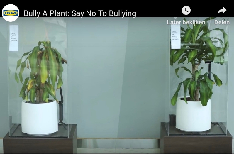Planten communiceren op hun eigen manier, soms door geur, soms door gif af te scheiden. En wtenschappelijk onderzoek liet zien dat planten constant kleine elektrische signalen afgeven. Zo is er een continue uitwisseling met de omgeving. Als mensen tegen planten gaan praten, gewoon met woorden, gedijen die planten extra goed. Op internet kwam ik een film van Ikea tegen over het project ‘Bully a plant’. Een plant die voortdurend gepest werd zag er na 30 dagen beduidend treuriger uit dan een plant die steeds lief werd toegesproken. Wat je zegt maakt dus ook verschil.