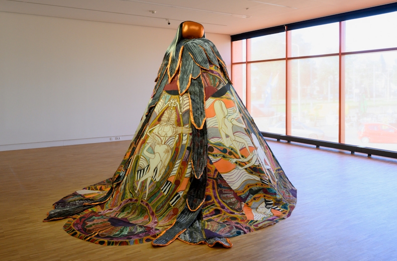 Toch is het met nadruk een tentoonstelling voor een breed publiek. Meteen bij binnenkomst staat er een hoge halfronde tent. De buitenkant is beschilderd met bloemvormige patronen en silhouetten van vrouwenlichamen, bovenop glimt een gouden bal. De binnenkant is versierd met donkere krullen, en er ligt een pop van een vrouwenlichaam op een rond kussen. Met draden zit ze vast aan het binnenste van de tent.