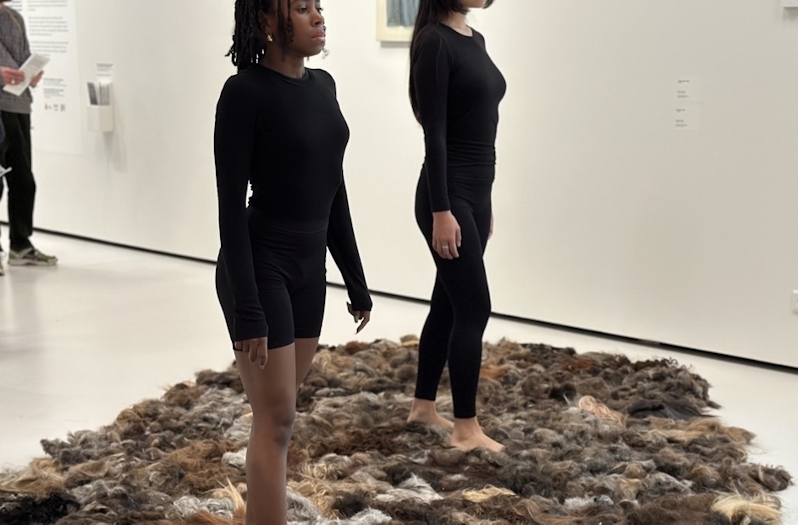 Twee in zwart geklede vrouwen stonden op een eilandje van plukken mensenhaar, Ze bewogen heel zachtjes naar voren en weer naar achteren met een lichte cirkel in de beweging. Ze ademden met de beweging mee. Op hun eiland van haar leken ze zich in een eigen veld te bevinden, onverstoorbaar temidden van alle drukte.