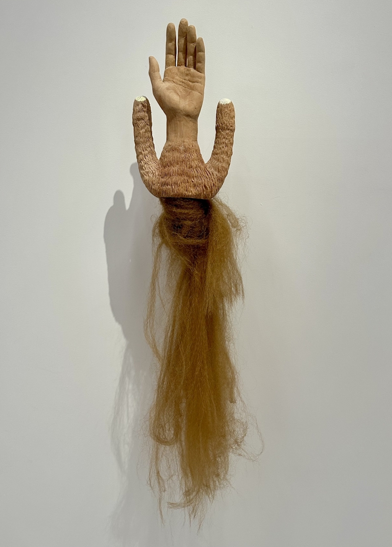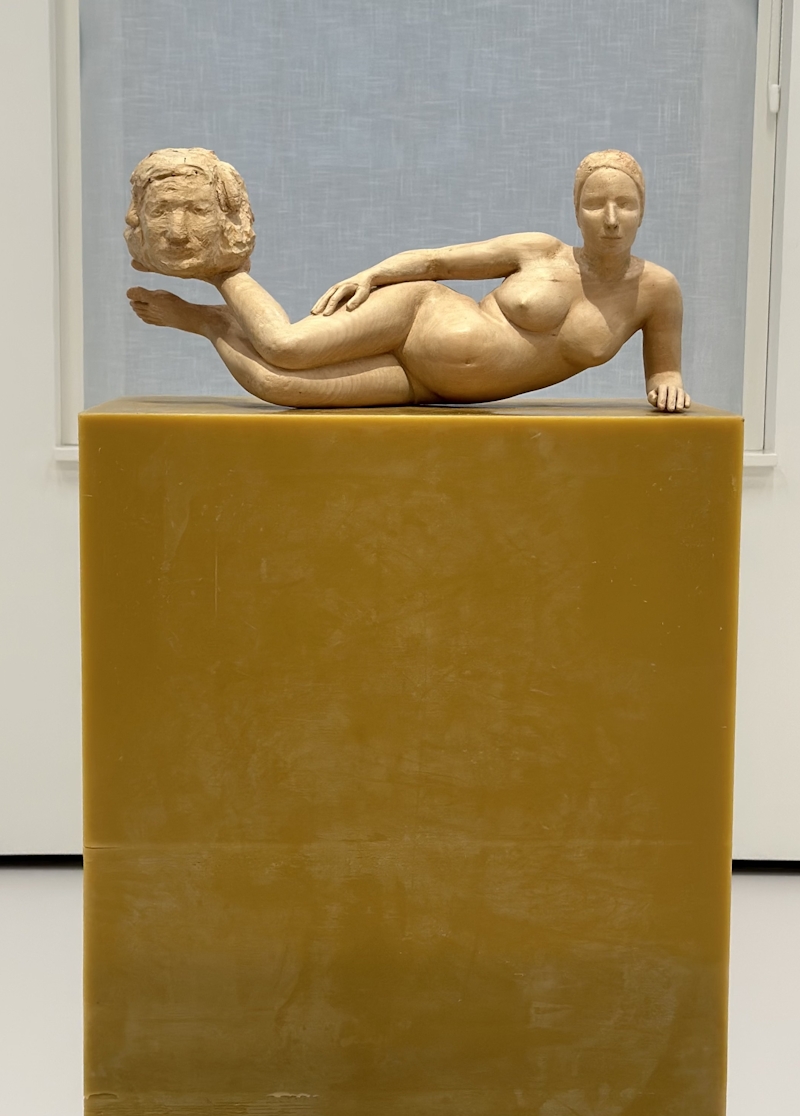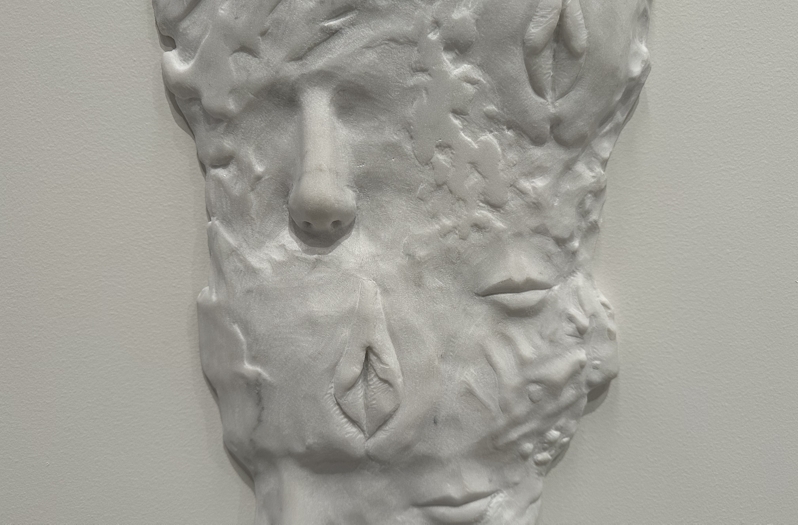 Een berg houtsnippers op de grond is misschien wel het meest wereldse dat in de expositie aanwezig is, de zweetdruppels van de noeste arbeid om de aanwezig beelden te snijden en hakken. Zoals een sculptuur vol neuzen, lippen, vulva’s en penissen die gehakt is uit marmer: wat moet dat een spannende onderneming zijn, het moet alsmaar goed gaan, iedere beslissing heeft onomkeerbare consequenties.