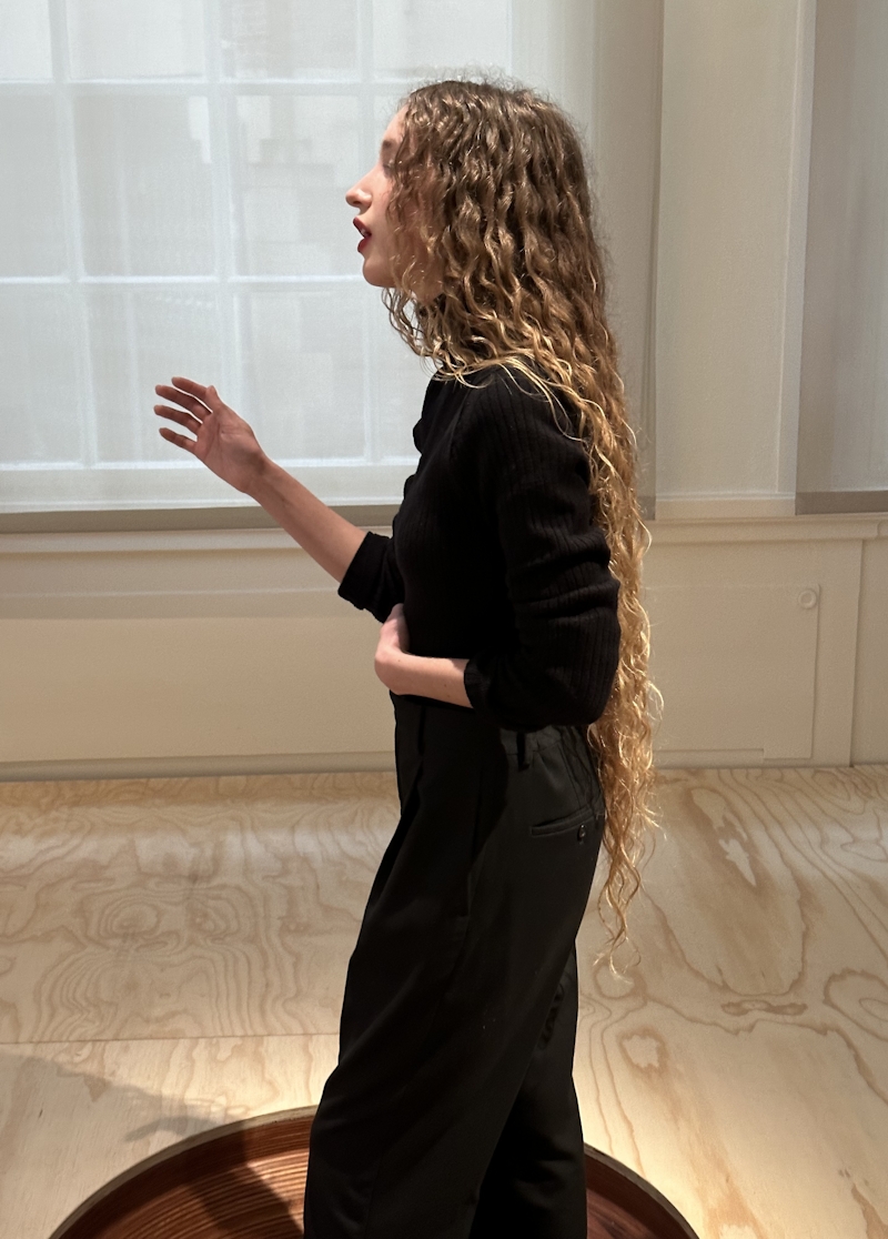 En in een andere kamer staat een vrouw met ongelooflijk lang haar in een bruin houten kom in de houten vloer met ook daarin weer plukken haar. Ik durf haar niet aan te kijken, alsof ik daarmee de betovering zou kunnen verbreken. En als ze dan ook nog gaat zingen is het als een handreiking uit de hemel.