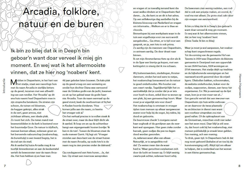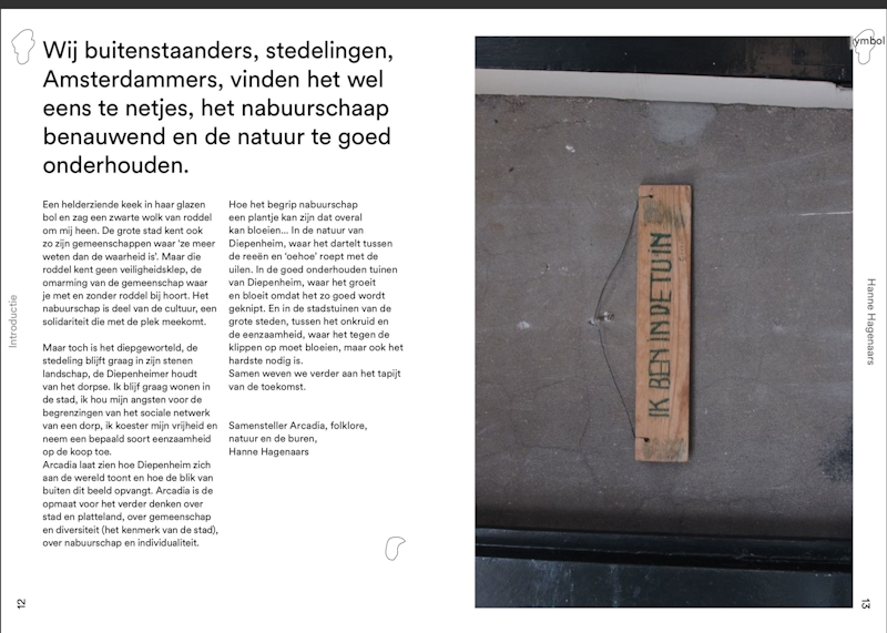 Wij buitenstaanders, stedelingen, Amsterdammers, vinden het weleens te netjes, het noaberschap te benauwend en de natuur te goed onderhouden. We houden van een zwart randje. Tegelijkertijd lijkt het zo aantrekkelijk dat je zonder dat je er iets voor hoeft te doen, enkel door te wonen op een plek, bij een gemeenschap hoort. Maar je moet je wel aanpassen, het noaberschap kent ongeschreven regels. Arcadia laat zien hoe Diepenheim zich aan de wereld toont en hoe de blik van buiten dit beeld opvangt. Arcadia is de opmaat voor het verder denken over stad en platteland, over gemeenschap en diversiteit (het kenmerk van de stad), over noaberschap en individualiteit. Arcadia is een onderzoek middels verhalen, foto’s en kunstenaarsbijdragen naar de identiteit van een kleine gemeenschap: Diepenheim.