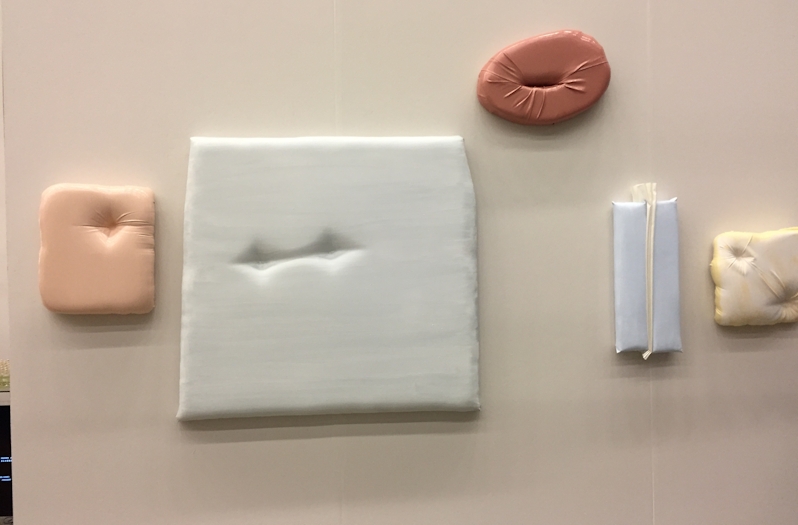 Nederige, bescheiden kunst dus. Wat moeten we ons daar bij voorstellen? Eerste indruk, nadat de blik langs een wand met foto’s van voetwassingen, tekeningen in inkt en een servies van porselein is gegaan: met formaat heeft nederigheid niets van doen. De werken zijn metershoog én piepklein. Met materiaal? We zien badstof en papier-maché. Kleur? Zachtheid troef.